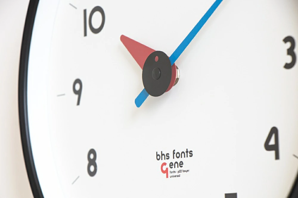 バウハウスの代表的なフォントデザイン、ユニバーサルアルファベットの遺伝子をもつフォントを採用した壁掛け時計です。