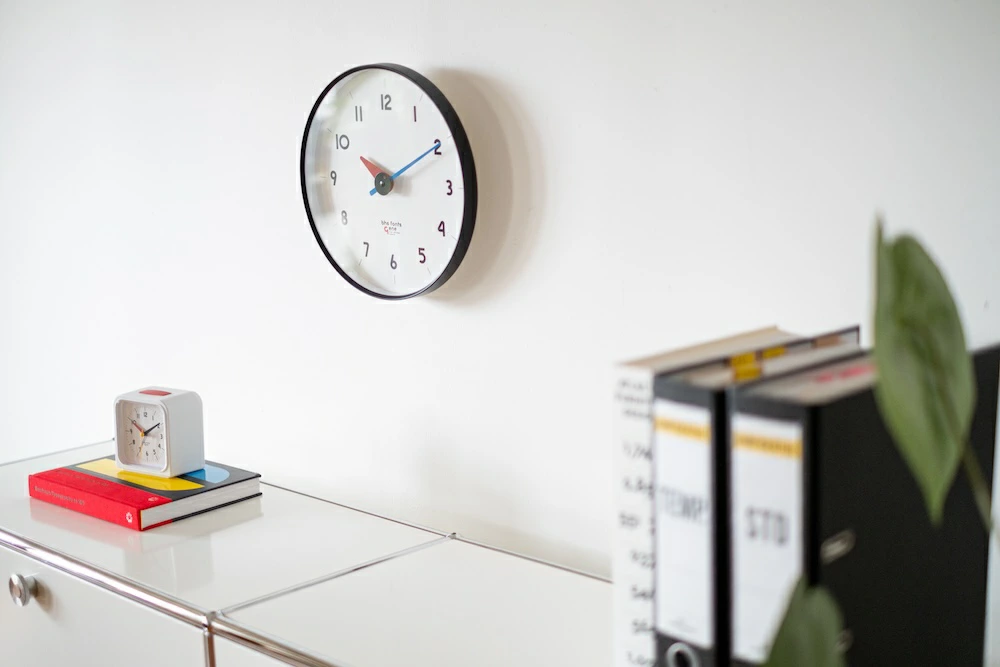 時針・分針・秒針はカラーアクセントが施され、アートのような雰囲気を演出します。