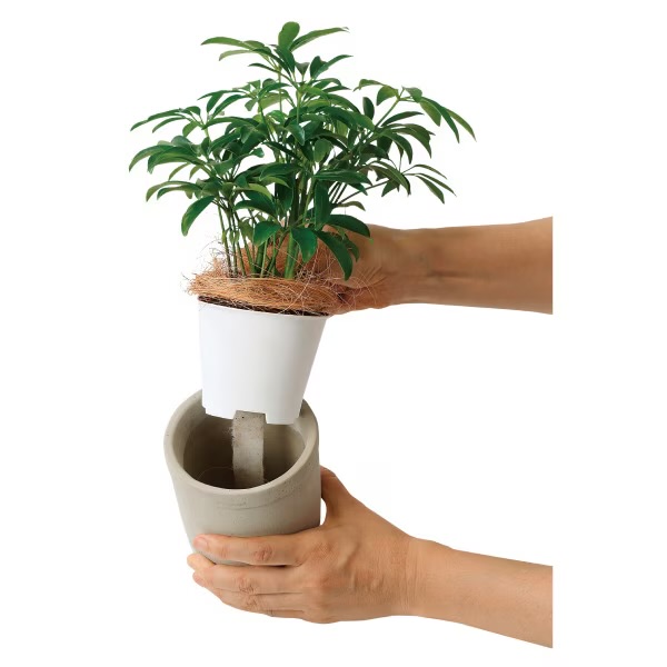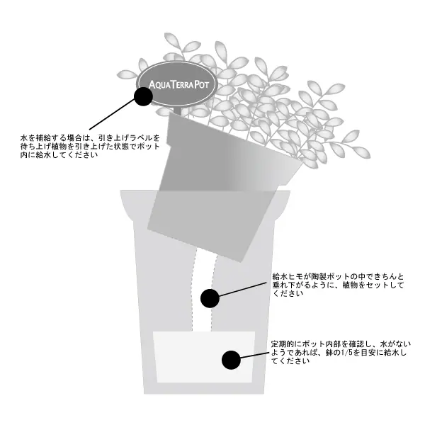 二重構造になっており、外側のポットに水をためることで、内ポットの底面から出る給水ヒモを通じ、植物が自分の欲しい量だけ水を吸い上げます。だから、水やりの加減がわかりやすく管理もカンタン。水量の目安は底から1センチほど、プラスティック素材の内ポットの底に水が浸らない程度に。