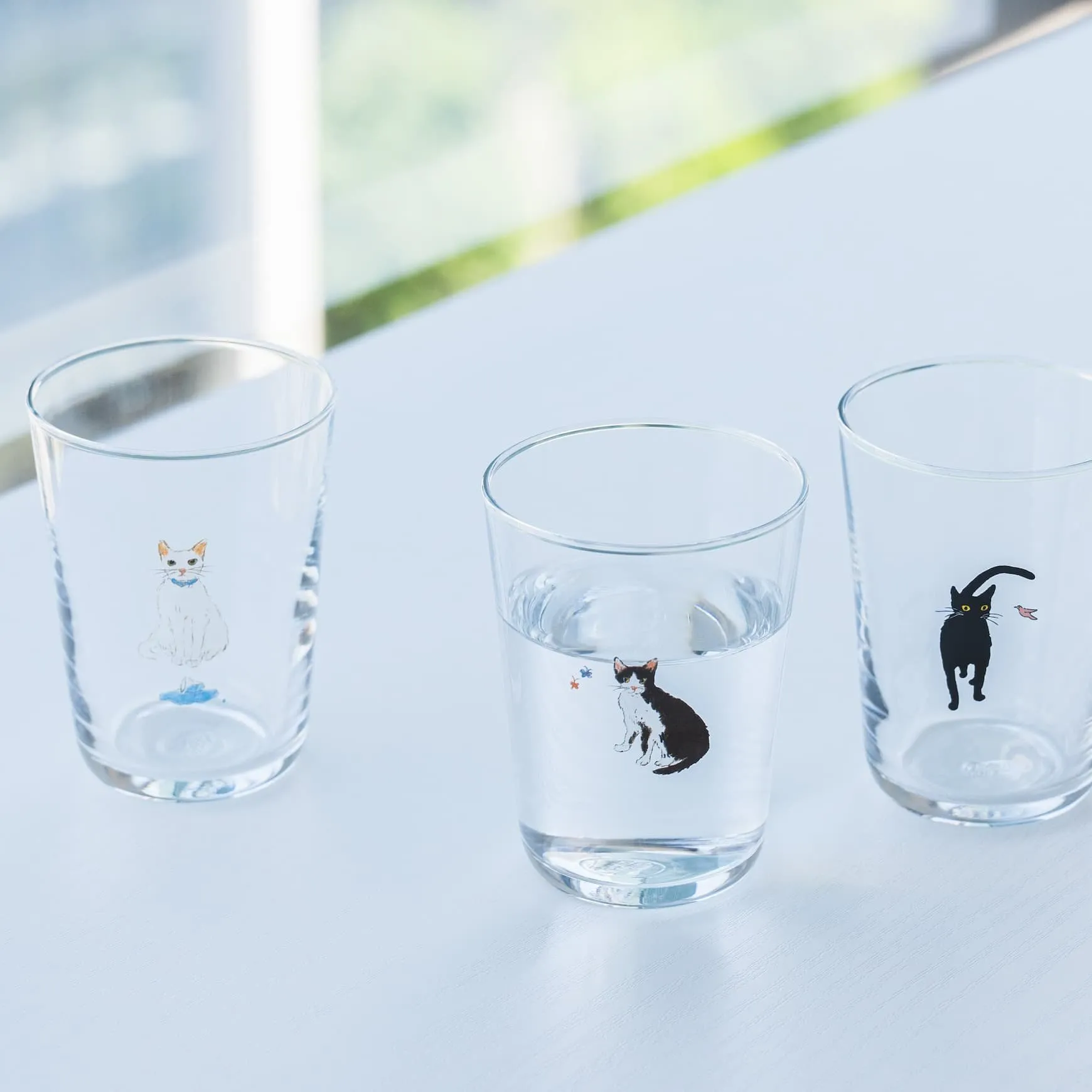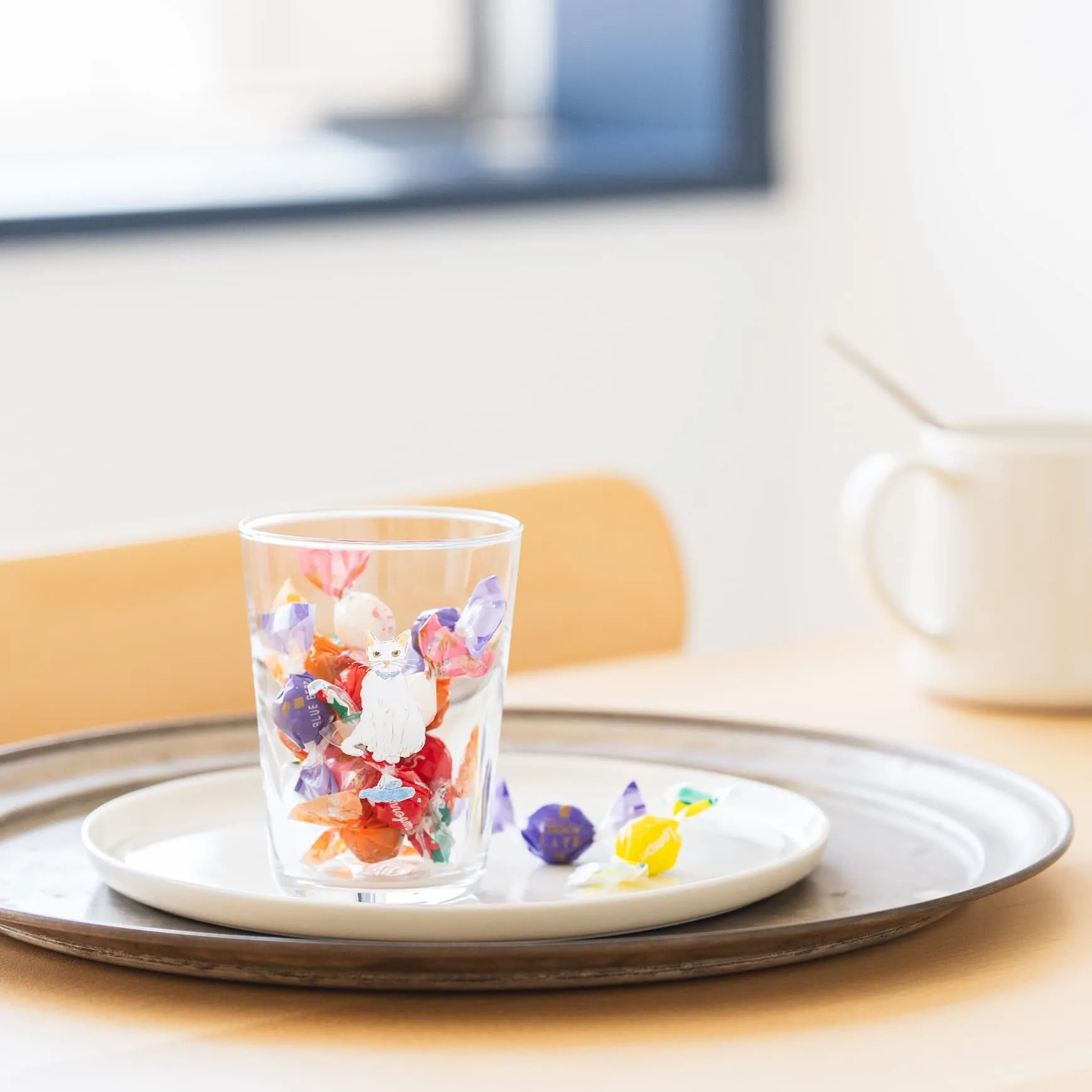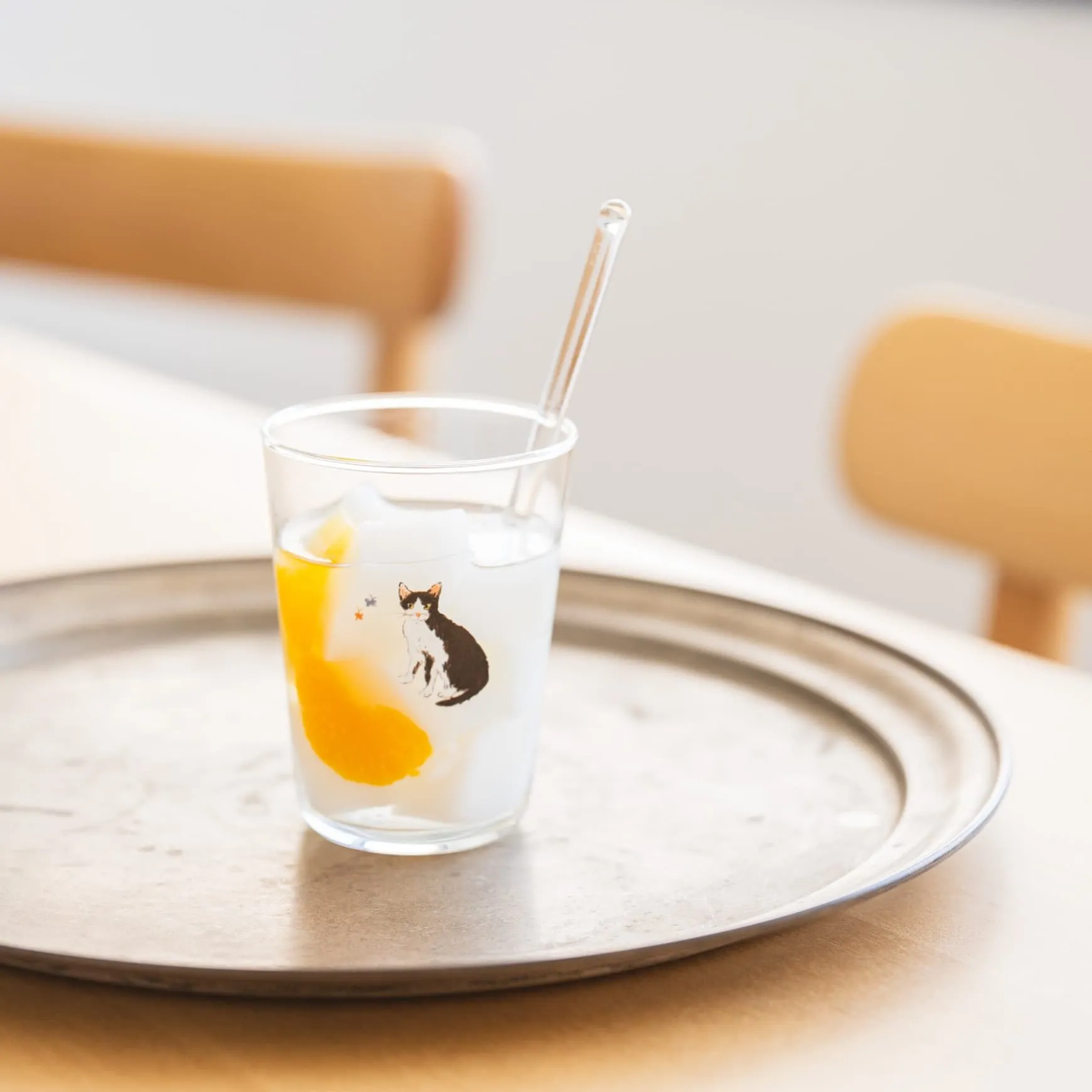 台湾の宴席でよく使われるビールグラスをもとにした、小ぶりで使いやすい形のコップ。透明なグラスに、優しいタッチで猫が描かれています。