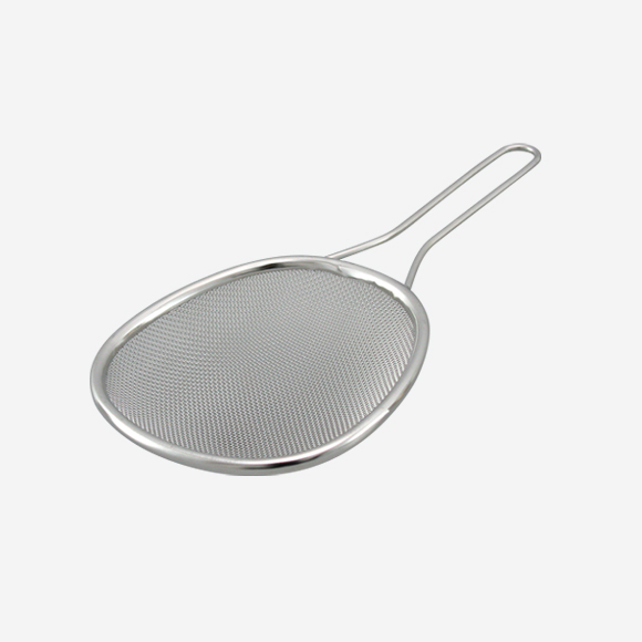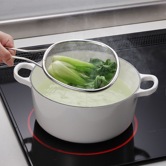 茹で野菜や麺類を一度にさっとすくえる、グローブ型のすくいザル。小さい鍋にも対応できるコンパクトサイズです。