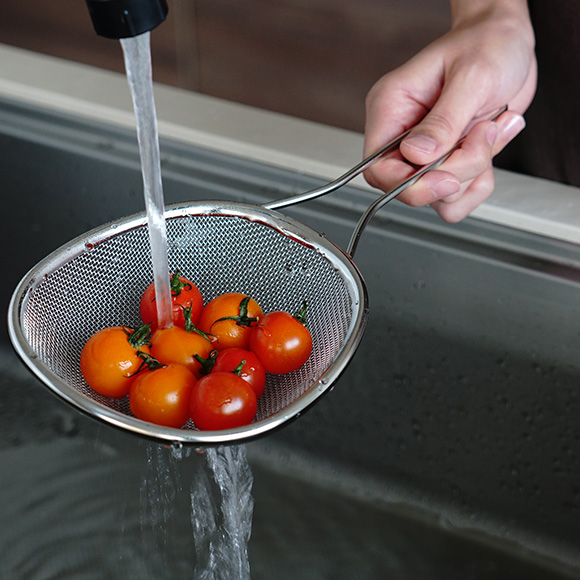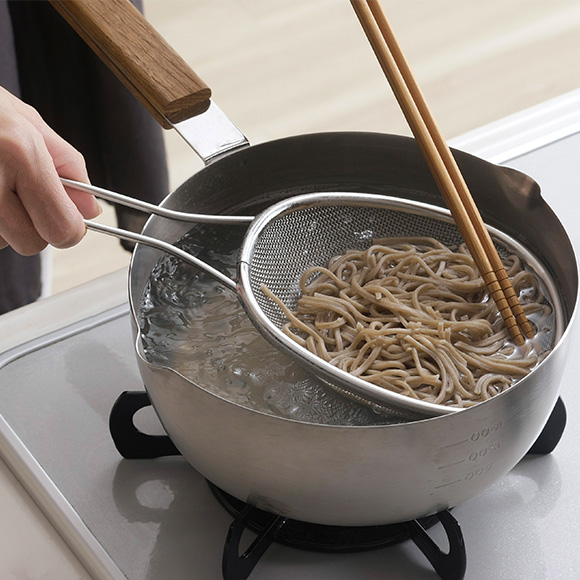 鍋底に残りがちな麺も、きれいにすくえます。そのまま湯切りや、水にさらすことも可能です。