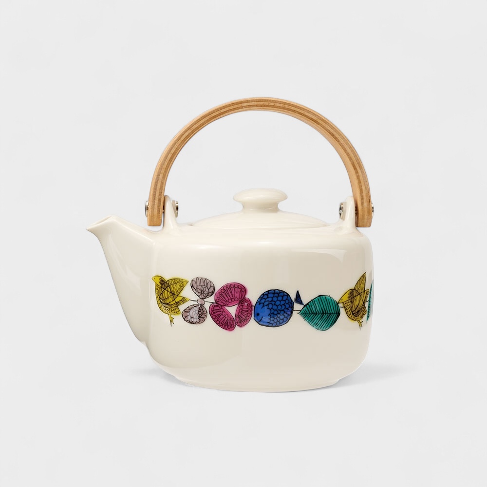色鮮やかな動植物達がサーカスの行進のように描かれた、北欧をイメージさせるデザインのティーポット。