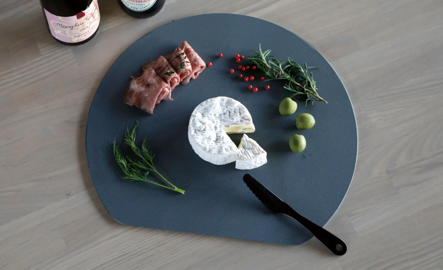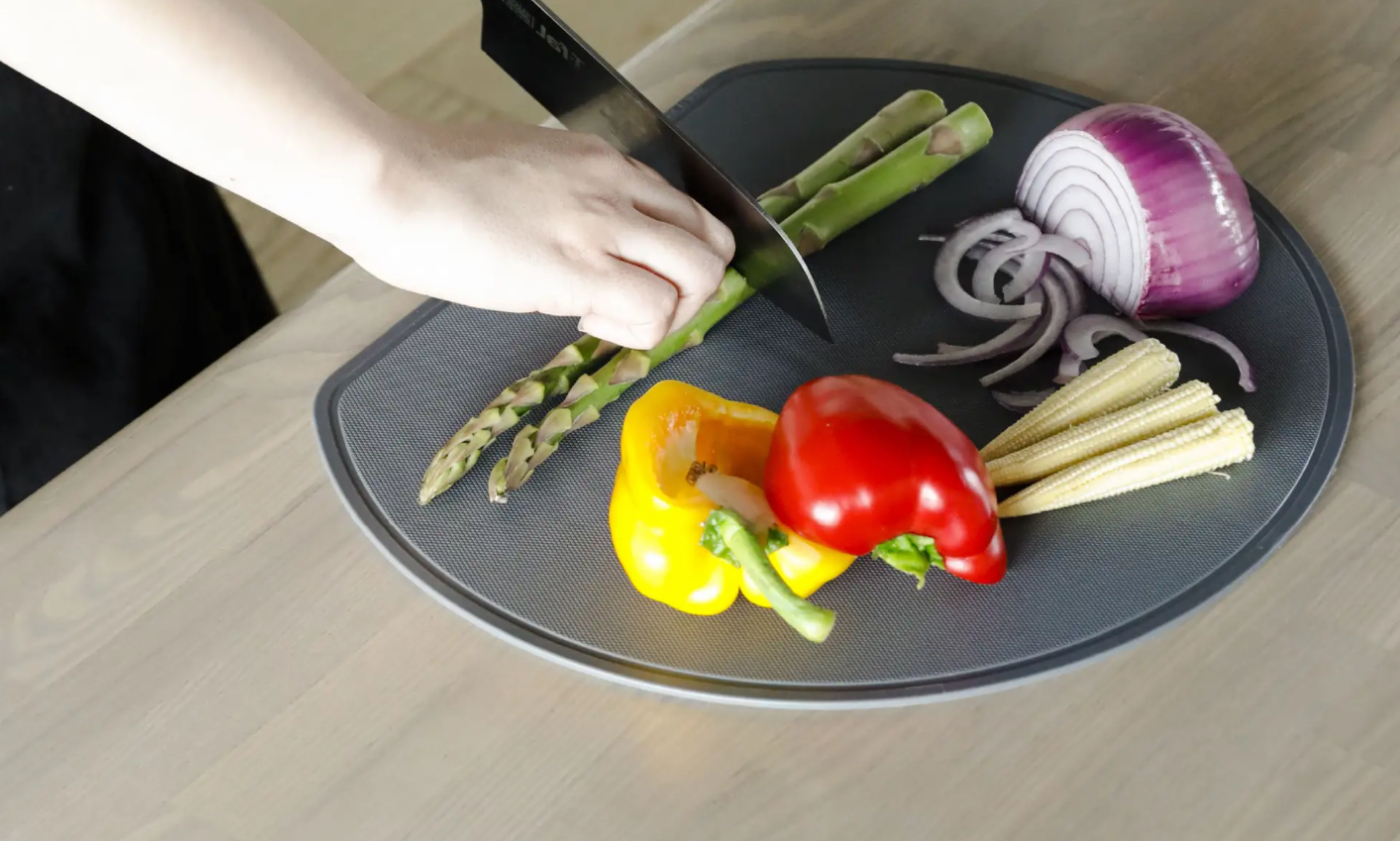 丸型の手前部分をカットした「スペースを無駄なく使える半月まな板」。