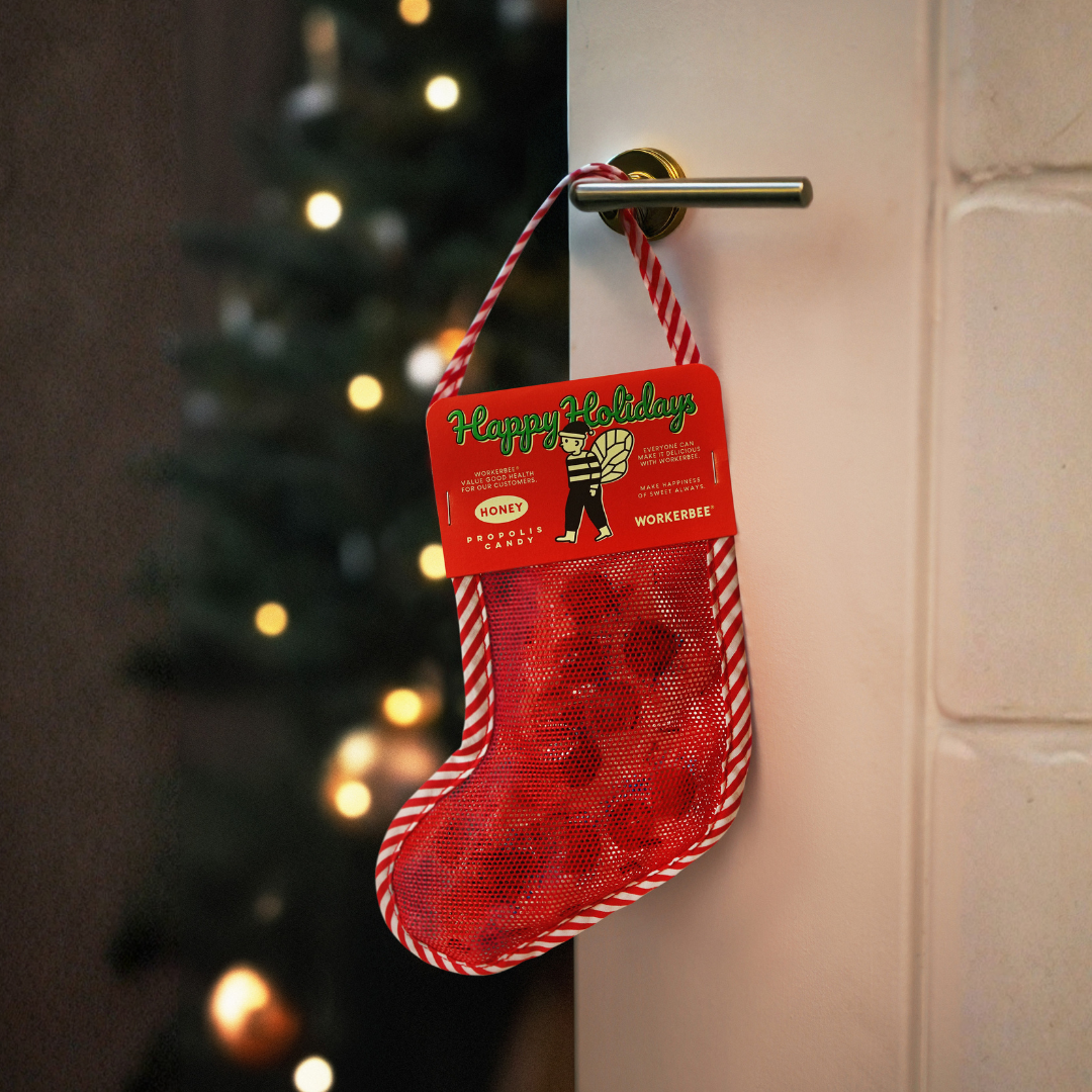 クリスマスの靴下型のバッグにはちみつプロポリスキャンディが詰まったホリーデーシーズン限定のスペシャルパッケージです。