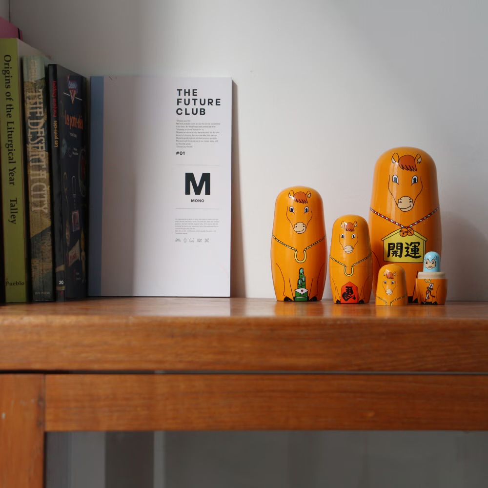 chabbit HAPPY NEW HORSE HAPPY NEW HORSE MIDORI KOMATSUデザインの干支シリーズの新作マトリョーシカです。 2026年の干支にちなんだ馬をモチーフとした、入子式になったユニークな5頭の馬たち。 ホースシュー、絵馬、左馬など縁起物を持った馬たちが新年を祝ってくれます。 最後には2027年の干支、羊が待機しています。 Φ6.5×H14.5cm / 190g 3960yen 2025-12-09 by chabbit chabbit interior < 鏡餅ふきん クラポティ >