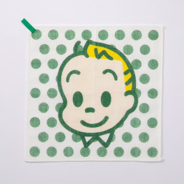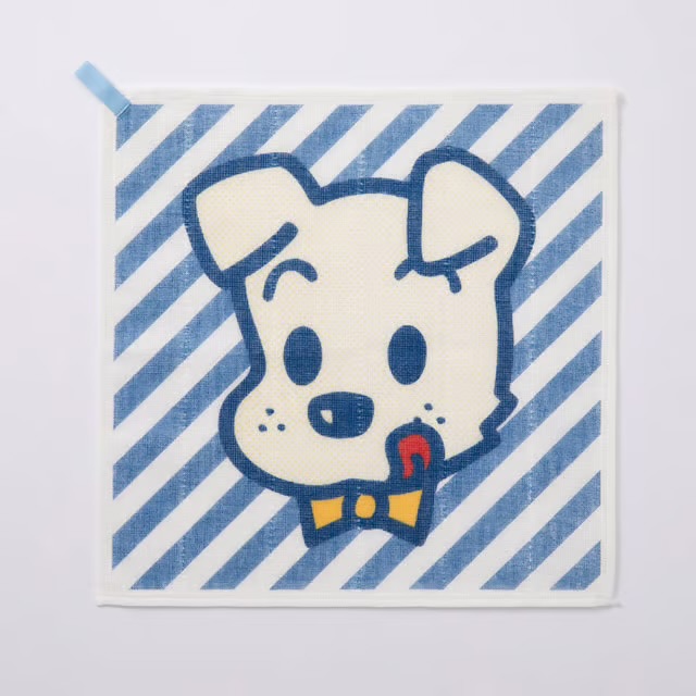 愛らしいキャラクターが映えるよう、30cm角の正方形のふきん全面に大きく顔をデザインしました。背景にはドットやボーダーなど明るくポップな柄をあわせ、キャラクターの魅力を引き立てています。ふきんの端にはアクセントとなるループが付いており、干す時などフックに掛けて便利にお使いいただけます。
