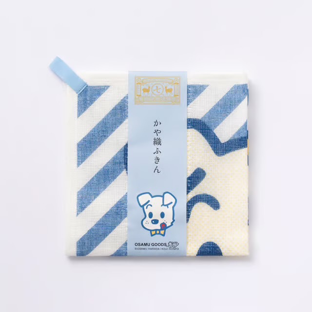 1980年代から90年代にかけて人気を博し、広く親しまれた「OSAMU GOODS」とコラボレーションしたかや織ふきんです。女の子の「ジル」や男の子の「ジャック」など、代表的なキャラクターの顔を大きく描きました。奈良の工芸「かや織」は奈良時代に日本に伝わった、「風は通すが蚊は通さない」という蚊帳(かや)に使われる目の粗い薄織物。綿のかや織を5枚重ねで縫い合わせたふきんは、使うほどにやわらかくなり、吸水性に優れ丈夫で長く使えます。