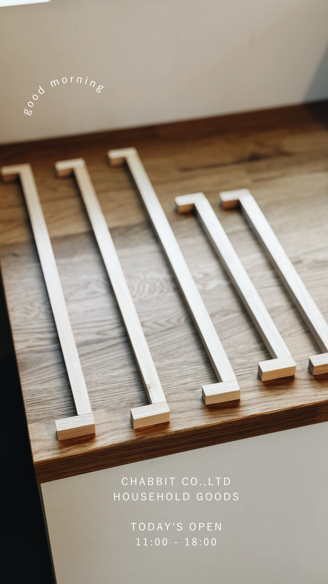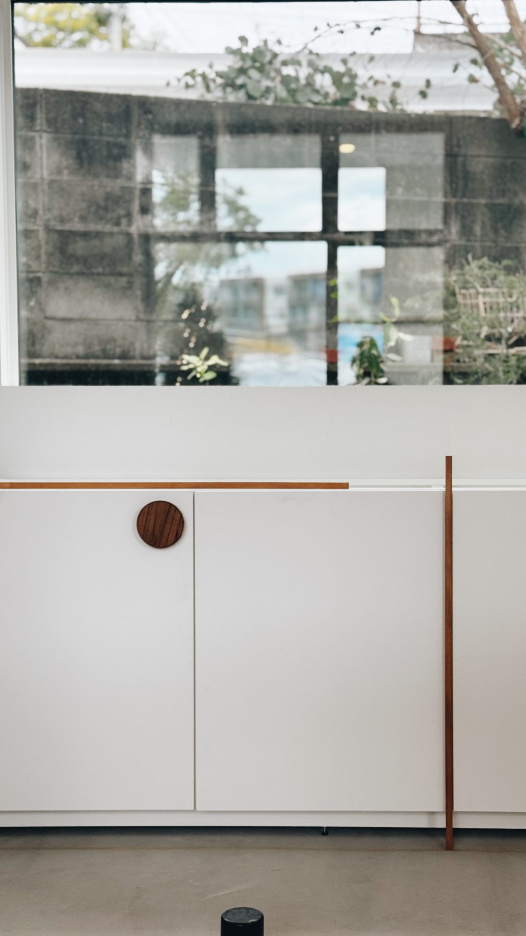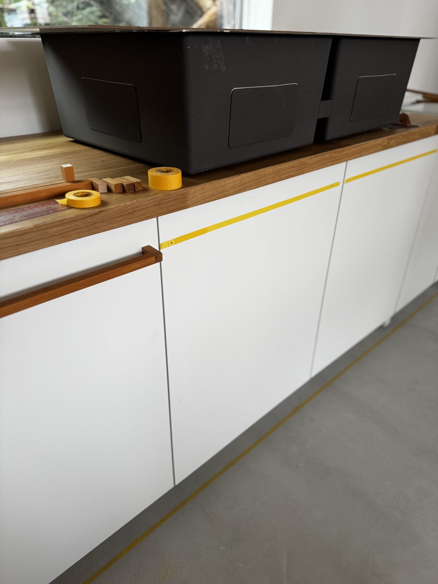 さて!取っ手はどうする?といろいろ配置。丸もかわいいけど各扉につくと大きすぎるなぁとか、縦はスッキリといい感じだけど、使い勝手はどうかな?とかしばらく悩みましたが、最終的にこのかたちに。↓