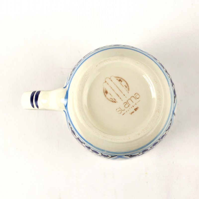 チュニジアSLAMA製の手描きマグカップです。鮮やかなチュニジアンブルーで描かれたエキゾチックな柄が素敵です。「POTTERY SLAMA」は、チュニジア北東部、陶器の町ナブールの老舗陶工で、美しいアラベスク模様をモチーフにすべて手描きで手作りされた陶器を生産しています。チュニジアは地中海沿岸という土地柄から、ヨーロッパとイスラム文化が融合した伝統工芸が盛んで、北アフリカ有数の陶器の生産地です。*こちらの商品は、食品検査を通していますので、食器としてご使用になれます。
